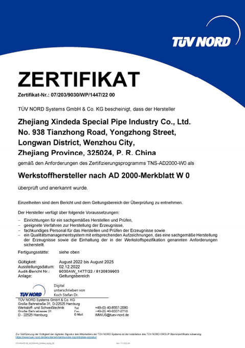 公司已全面通過了ISO9001:2008質量管理體系認證、14000環境管理體系認證、18000職業健康管理體系認證、國家質量檢驗檢疫總局A2-B類壓力管道元件制造許可、 歐盟PED認證及德國AD-2000產品強制認證、美國ASME材料產品認證、信得達擁有1條穿孔生產線,10條冷拔生產線8條冷軋特種無縫鋼管生產線。